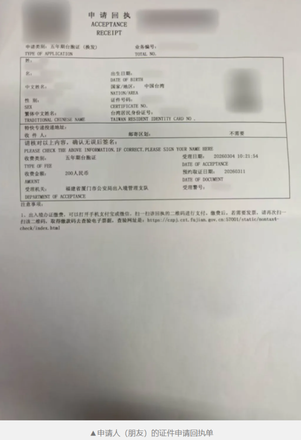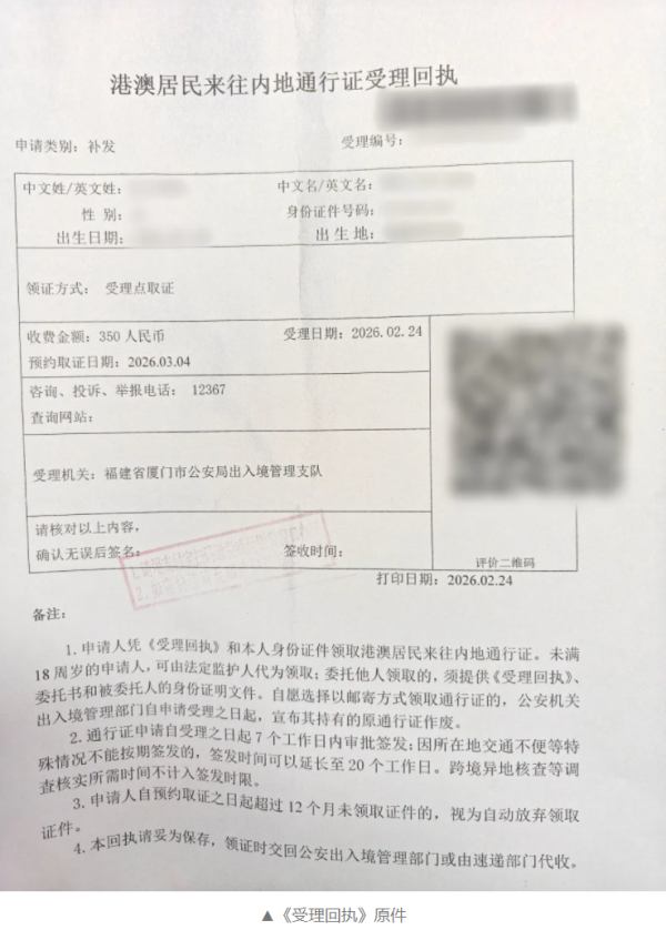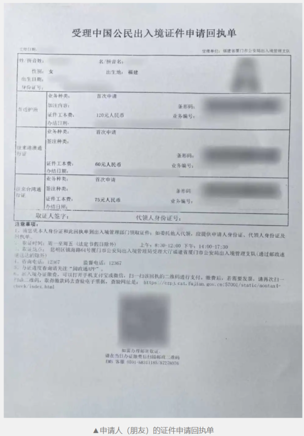领取地址:镇海路厦门出入境大楼二楼8号发证窗口代领。