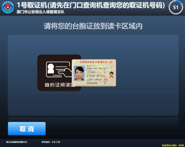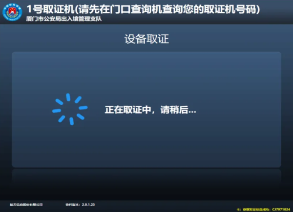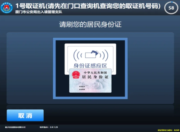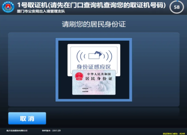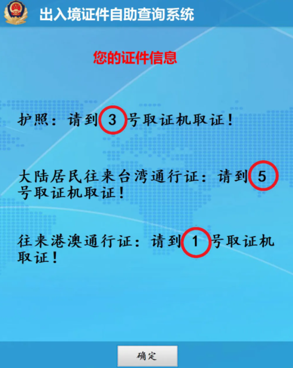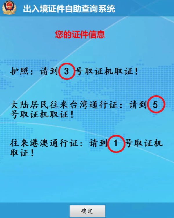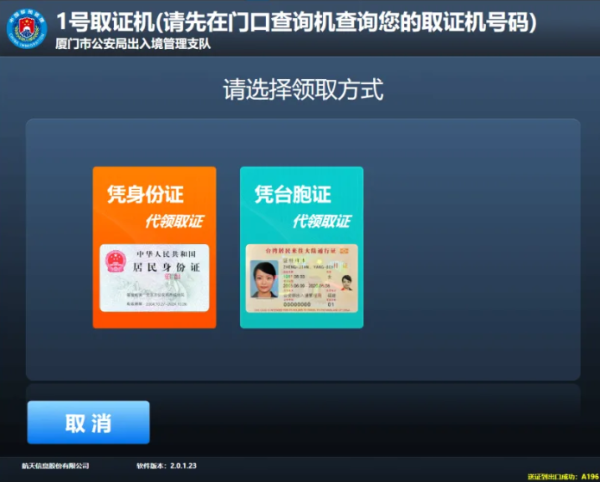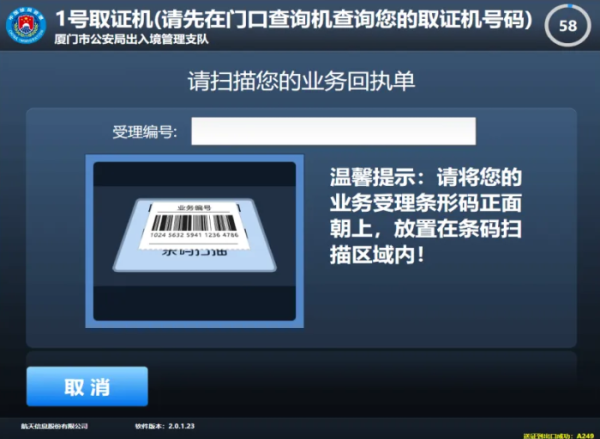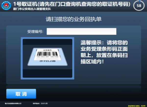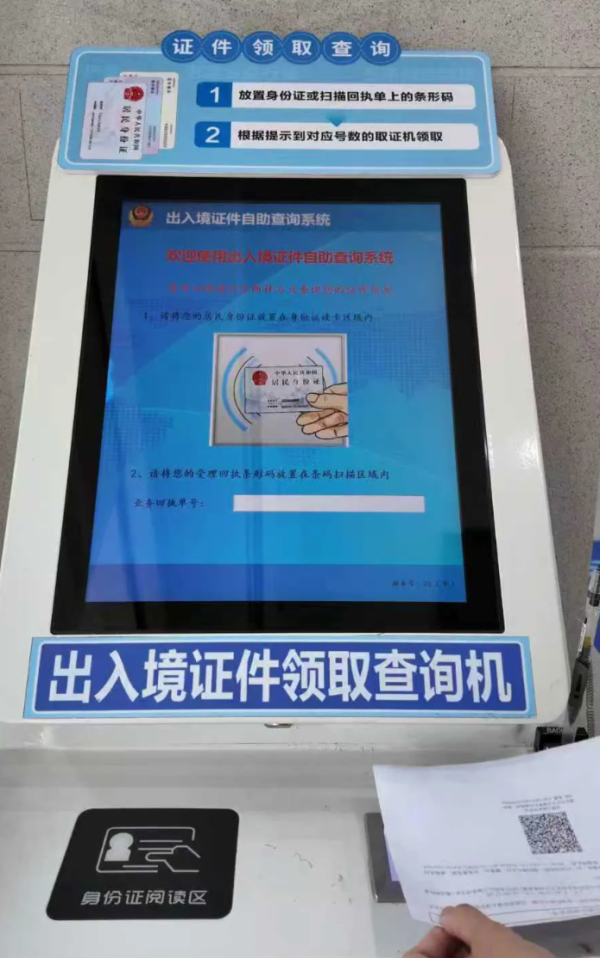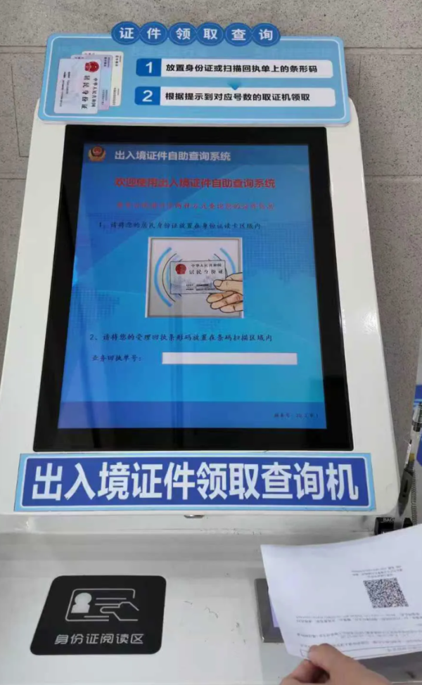 第一步:在出入境证件领取查询机上扫描回执单上的条码,根据页面提示到对应的取证机领取证件