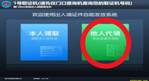 第一步:在出入境证件领取查询机上扫描回执单上的条码,根据页面提示到对应的取证机,点击他人代理