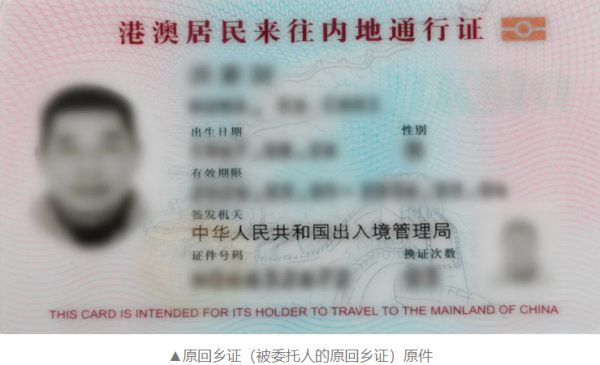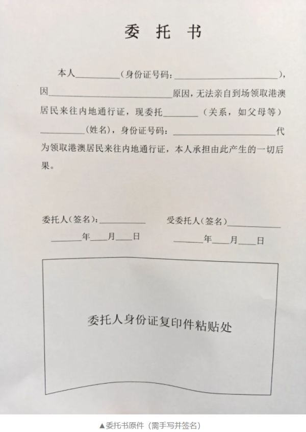 ▲18周岁以上的成年人若委托他人代领,须提供《申请回执》原件、委托书原件、原回乡证和被委托人身份证明原件代为领取。