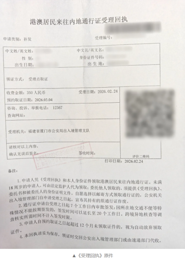 ▲未满18周岁的未成年人可由法定监护人带上《申请回执》原件、原回乡证及法定监护人身份证明原件代为领取;