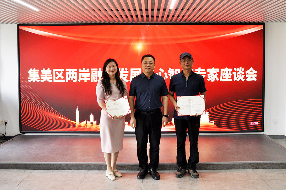 集美区两岸融合发展专家智库成立于2021年,旨在更好团结凝聚海峡两岸高校、科研院所中的涉台研究专家学者,构建高效联动的决策咨询服务体系。发展至今,专家队伍不断壮大。当天随后召开的交流座谈会上,专家智库又吸纳了8位新专家成员。在与会专家的共同见证下,集美区委办领导为新专家成员代表颁发证书。