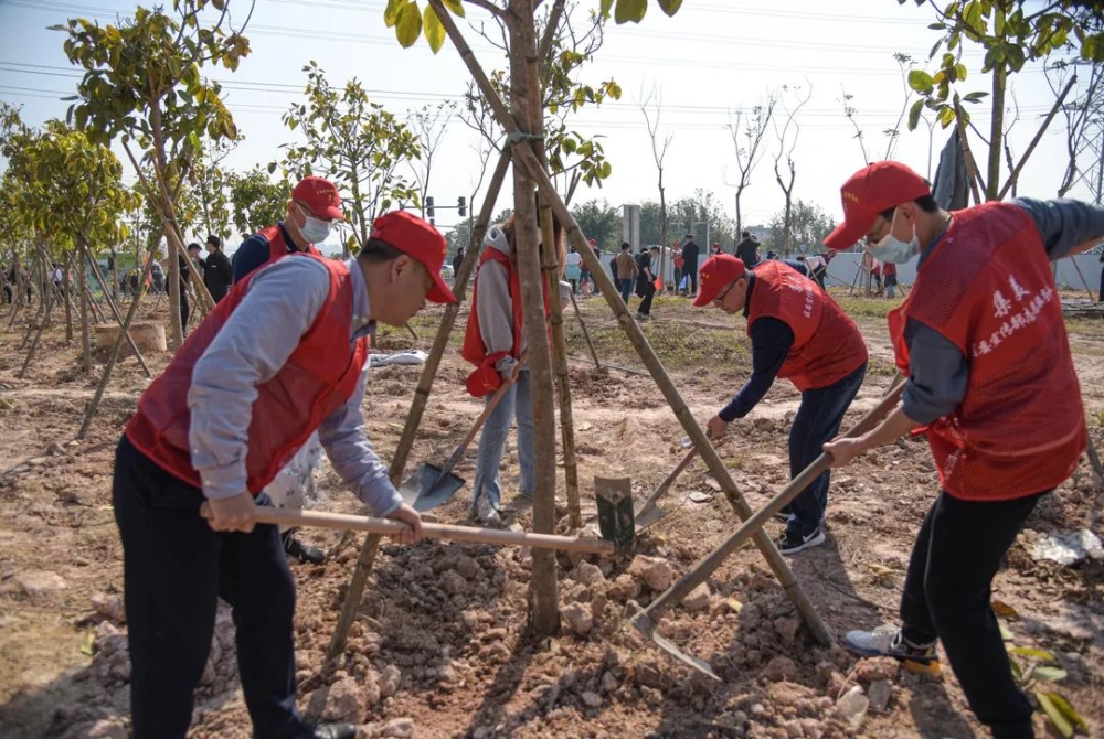 大家纷纷拿起工具,挥锹铲土、扶苗浇水,相互协作,一阵忙碌过后,400多株特色树种被栽下。据介绍,本次植树栽植面积6700多平方米,包含了火焰木、富贵榕、秋枫等树种。